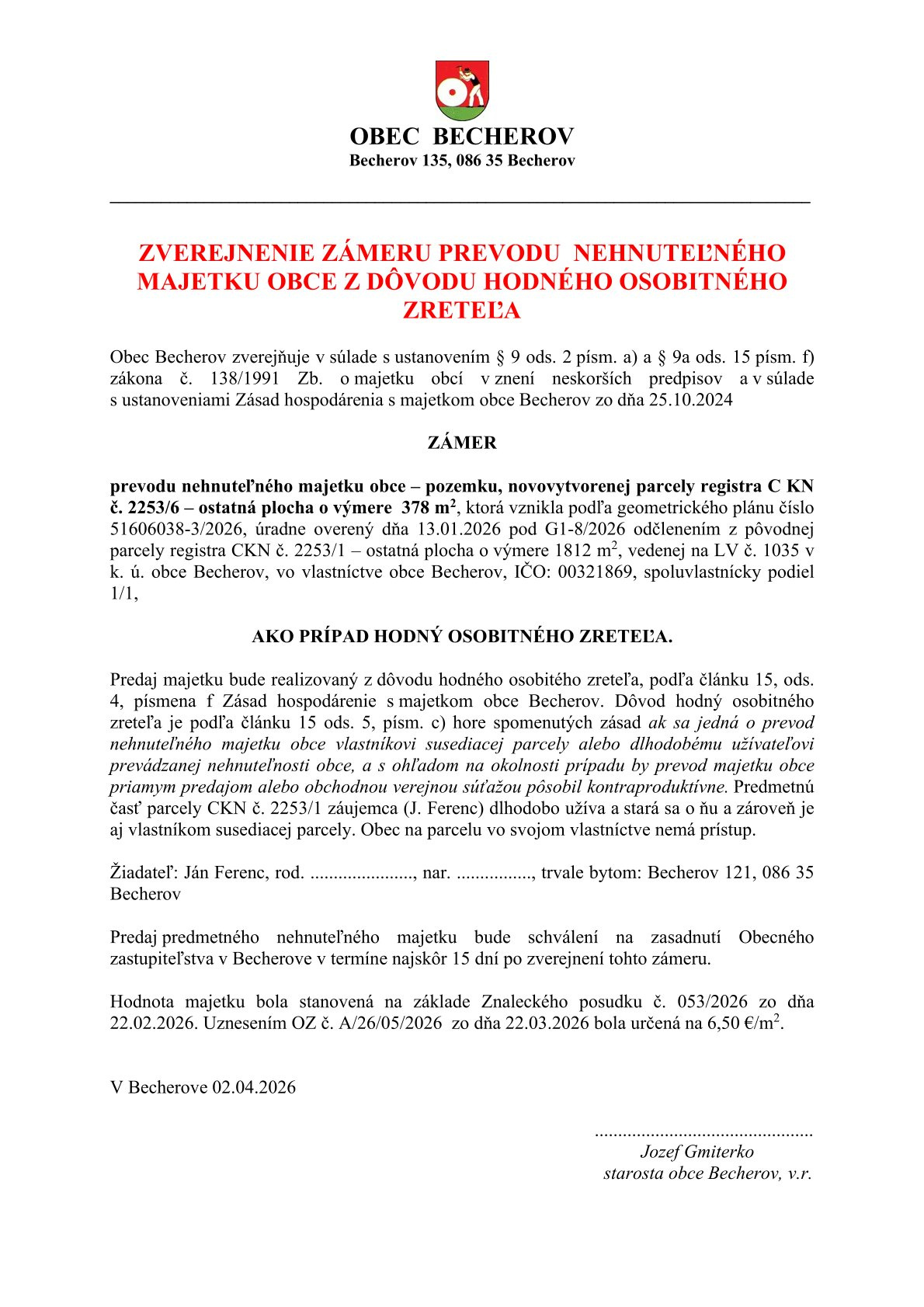 Zverejnenie zámeru prevodu nehnuteľného majetku obce z dôvodu hodného osobitného zerteľa